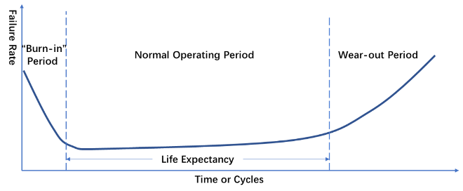对于MTBF这个概念,可靠性领域在上个世纪50年代已开始用于预计相关军用设备的可靠性水平[3],到现在近70年。当然对于这个概念,在各行业产品的应用,还存在些“非议”,如很多人将MTBF与一般意义寿命混为一谈;MTBF达近百万小时的芯片或者电子设备如何评定。为解决这些工程界困惑,我们还须引入可靠性领域另外一个概念“Bathtub curve”。“浴盆曲线”定义最早出现在上个世纪60年代[4],它将失效率曲线在产品寿命周期内分成三个阶段:早期失效期(“Burn-in” Period)、偶然失效期(Normal Operating Period)、耗损失效期(Wear-out Period)。